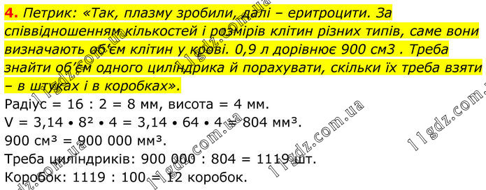 4. Петрик: «Так, плазму зробили, далі – еритроцити. За співвідношенням кількостей і розмірів клітин різних типів, саме вони визначають об’єм клітин у крові. 0,9 л дорівнює 900 см3 . Треба знайти об’єм одного циліндрика й порахувати, скільки їх треба взяти – в штуках і в коробках». Радіус = 16 : 2 = 8 мм, висота = 4 мм. V = 3,14 • 8² • 4 = 3,14 • 64 • 4 = 804 мм³. 900 см³ = 900 000 мм³. Треба циліндриків: 900 000 : 804 = 1119 шт. Коробок: 1119 : 100 = 12 коробок.