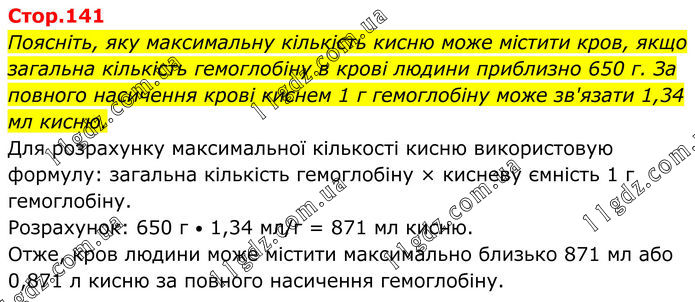 Поясніть, яку максимальну кількість кисню може містити кров, якщо загальна кількість гемоглобіну в крові людини приблизно 650 г. За повного насичення крові киснем 1 г гемоглобіну може зв'язати 1,34 мл кисню. Для розрахунку максимальної кількості кисню використовую формулу: загальна кількість гемоглобіну × кисневу ємність 1 г гемоглобіну. Розрахунок: 650 г • 1,34 мл/г = 871 мл кисню. Отже, кров людини може містити максимально близько 871 мл або 0,871 л кисню за повного насичення гемоглобіну.