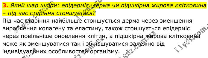 3. Який шар шкіри: епідерміс, дерма чи підшкірна жирова клітковина – під час старіння стоншується? Під час старіння найбільше стоншується дерма через зменшення вироблення колагену та еластину, також стоншується епідерміс через повільніше оновлення клітин, а підшкірна жирова клітковина може як зменшуватися так і збільшуватися залежно від індивідуальних особливостей організму.