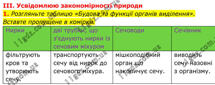 ІІІ. Усвідомлюю закономірності природи 1. Розгляньте таблицю «Будова та функції органів виділення». Вставте пропущене в комірки. Нирки дві трубки, що з'єднують нирки із сечовим міхуром Сечоводи Сечівник фільтрують кров та утворюють сечу. транспортують сечу від нирок до сечового міхура. мішкоподібний орган що накопичує сечу. виводить сечу назовні з організму.