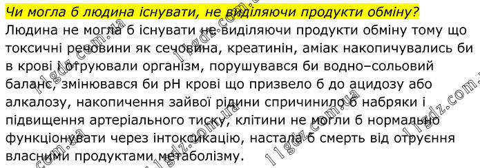 Чи могла б людина існувати, не виділяючи продукти обміну? Людина не могла б існувати не виділяючи продукти обміну тому що токсичні речовини як сечовина, креатинін, аміак накопичувались би в крові і отруювали організм, порушувався би водно–сольовий баланс, змінювався би pH крові що призвело б до ацидозу або алкалозу, накопичення зайвої рідини спричинило б набряки і підвищення артеріального тиску, клітини не могли б нормально функціонувати через інтоксикацію, настала б смерть від отруєння власними продуктами метаболізму.