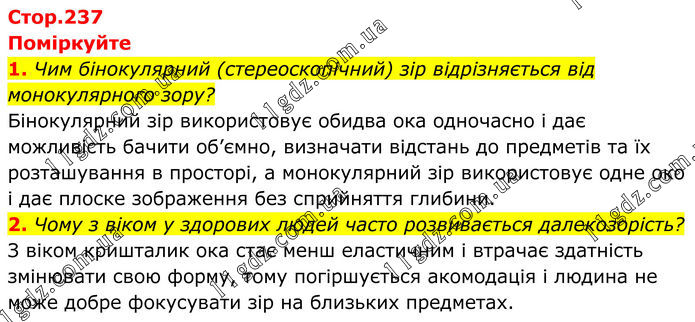Поміркуйте 1. Чим бінокулярний (стереоскопічний) зір відрізняється від монокулярного зору? Бінокулярний зір використовує обидва ока одночасно і дає можливість бачити об’ємно, визначати відстань до предметів та їх розташування в просторі, а монокулярний зір використовує одне око і дає плоске зображення без сприйняття глибини. 2. Чому з віком у здорових людей часто розвивається далекозорість? З віком кришталик ока стає менш еластичним і втрачає здатність змінювати свою форму, тому погіршується акомодація і людина не може добре фокусувати зір на близьких предметах.