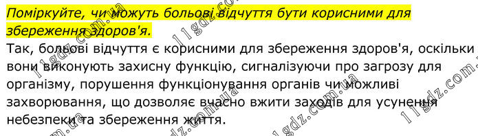 Поміркуйте, чи можуть больові відчуття бути корисними для збереження здоров'я. Так, больові відчуття є корисними для збереження здоров'я, оскільки вони виконують захисну функцію, сигналізуючи про загрозу для організму, порушення функціонування органів чи можливі захворювання, що дозволяє вчасно вжити заходів для усунення небезпеки та збереження життя.