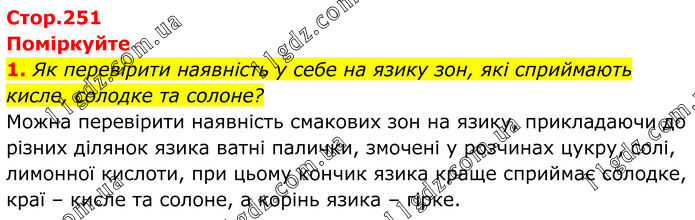 Поміркуйте 1. Як перевірити наявність у себе на язику зон, які сприймають кисле, солодке та солоне? Можна перевірити наявність смакових зон на язику, прикладаючи до різних ділянок язика ватні палички, змочені у розчинах цукру, солі, лимонної кислоти, при цьому кончик язика краще сприймає солодке, краї – кисле та солоне, а корінь язика – гірке.