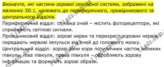 Визначте, які частини зорової сенсорної системи, зображені на малюнку 50.1, належать до периферичного, провідникового та центрального відділів. Периферичний відділ: сітківка очей – містить фоторецептори, які сприймають світлові сигнали. Провідниковий відділ: зорові нерви та перехрест зорових нервів – передають нервові імпульси від очей до головного мозку. Центральний відділ: зорові зони кори потиличних часток великих півкуль, ліва півкуля, права півкуля – обробляють зорову інформацію та формують зорові образи.