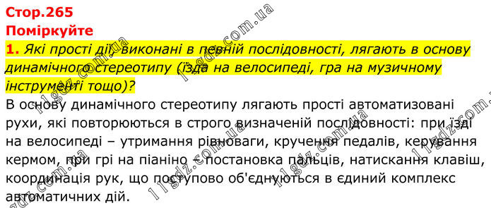 Поміркуйте 1. Які прості дії, виконані в певній послідовності, лягають в основу динамічного стереотипу (їзда на велосипеді, гра на музичному інструменті тощо)? В основу динамічного стереотипу лягають прості автоматизовані рухи, які повторюються в строго визначеній послідовності: при їзді на велосипеді – утримання рівноваги, кручення педалів, керування кермом, при грі на піаніно – постановка пальців, натискання клавіш, координація рук, що поступово об'єднуються в єдиний комплекс автоматичних дій.