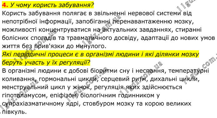 4. У чому користь забування? Користь забування полягає в звільненні нервової системи від непотрібної інформації, запобіганні перенавантаженню мозку, можливості концентруватися на актуальних завданнях, стиранні болісних спогадів та травматичного досвіду, адаптації до нових умов життя без прив'язки до минулого. Які періодичні процеси є в організмі людини і які ділянки мозку беруть участь у їх регуляції? В організмі людини є добові біоритми сну і неспання, температурні коливання, гормональні цикли, серцевий ритм, дихальні цикли, менструальний цикл у жінок, регуляція яких здійснюється гіпоталамусом, епіфізом, біологічним годинником у супрахіазматичному ядрі, стовбуром мозку та корою великих півкуль.