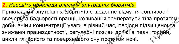 2. Наведіть приклади власних внутрішніх біоритмів. Прикладами внутрішніх біоритмів є щоденне відчуття сонливості ввечері та бадьорості вранці, коливання температури тіла протягом доби, зміни концентрації уваги в різний час, періоди підвищеної та зниженої працездатності, регулярні позиви до їжі в певні години, цикли глибокого та поверхневого сну протягом ночі.
