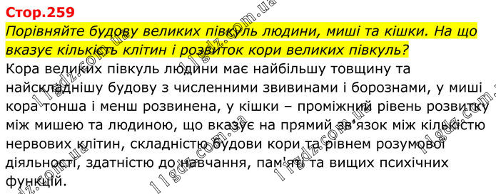 Порівняйте будову великих півкуль людини, миші та кішки. На що вказує кількість клітин і розвиток кори великих півкуль? Кора великих півкуль людини має найбільшу товщину та найскладнішу будову з численними звивинами і борознами, у миші кора тонша і менш розвинена, у кішки – проміжний рівень розвитку між мишею та людиною, що вказує на прямий зв'язок між кількістю нервових клітин, складністю будови кори та рівнем розумової діяльності, здатністю до навчання, пам'яті та вищих психічних функцій.