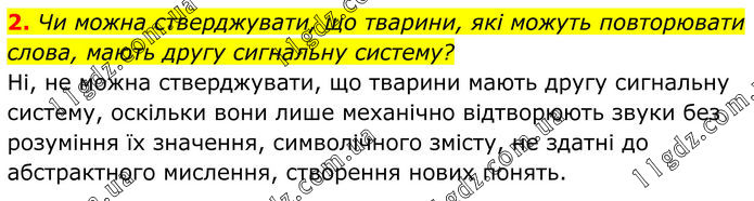 2. Чи можна стверджувати, що тварини, які можуть повторювати слова, мають другу сигнальну систему? Ні, не можна стверджувати, що тварини мають другу сигнальну систему, оскільки вони лише механічно відтворюють звуки без розуміння їх значення, символічного змісту, не здатні до абстрактного мислення, створення нових понять.