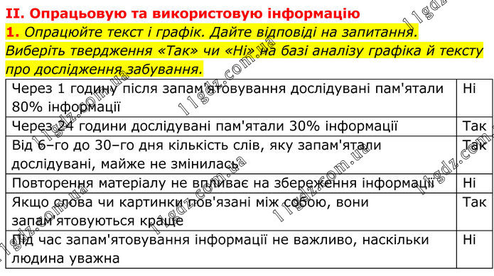 ІІ. Опрацьовую та використовую інформацію 1. Опрацюйте текст і графік. Дайте відповіді на запитання. Виберіть твердження «Так» чи «Ні» на базі аналізу графіка й тексту про дослідження забування. Через 1 годину після запам'ятовування дослідувані пам'ятали 80% інформації Ні Через 24 години дослідувані пам'ятали 30% інформації Так Від 6–го до 30–го дня кількість слів, яку запам'ятали дослідувані, майже не змінилась Так Повторення матеріалу не впливає на збереження інформації Ні Якщо слова чи картинки пов'язані між собою, вони запам'ятовуються краще Так Під час запам'ятовування інформації не важливо, наскільки людина уважна Ні