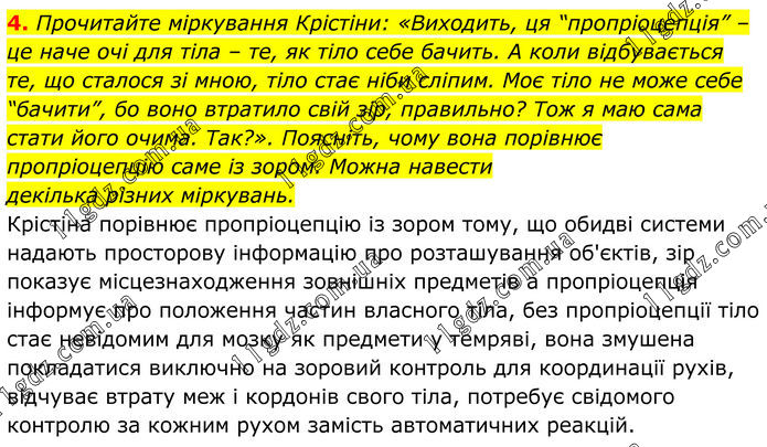 4. Прочитайте міркування Крістіни: «Виходить, ця “пропріоцепція” – це наче очі для тіла – те, як тіло себе бачить. А коли відбувається те, що сталося зі мною, тіло стає ніби сліпим. Моє тіло не може себе “бачити”, бо воно втратило свій зір, правильно? Тож я маю сама стати його очима. Так?». Поясніть, чому вона порівнює пропріоцепцію саме із зором. Можна навести декілька різних міркувань. Крістіна порівнює пропріоцепцію із зором тому, що обидві системи надають просторову інформацію про розташування об'єктів, зір показує місцезнаходження зовнішніх предметів а пропріоцепція інформує про положення частин власного тіла, без пропріоцепції тіло стає невідомим для мозку як предмети у темряві, вона змушена покладатися виключно на зоровий контроль для координації рухів, відчуває втрату меж і кордонів свого тіла, потребує свідомого контролю за кожним рухом замість автоматичних реакцій.