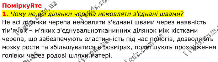 Поміркуйте 1. Чому не всі ділянки черепа немовляти з'єднані швами? Не всі ділянки черепа немовляти з'єднані швами через наявність тім'ячок – м'яких з'єднувальнотканинних ділянок між кістками черепа, що забезпечують еластичність під час пологів, дозволяють мозку рости та збільшуватися в розмірах, полегшують проходження голівки через родові шляхи матері.