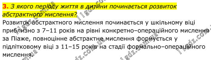 3. З якого періоду життя в дитини починається розвиток абстрактного мислення? Розвиток абстрактного мислення починається у шкільному віці приблизно з 7–11 років на рівні конкретно–операційного мислення за Піаже, повноцінне абстрактне мислення формується у підлітковому віці з 11–15 років на стадії формально–операційного мислення.