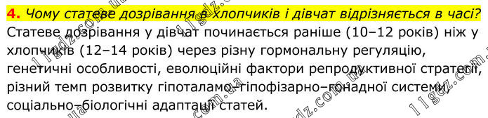 4. Чому статеве дозрівання в хлопчиків і дівчат відрізняється в часі? Статеве дозрівання у дівчат починається раніше (10–12 років) ніж у хлопчиків (12–14 років) через різну гормональну регуляцію, генетичні особливості, еволюційні фактори репродуктивної стратегії, різний темп розвитку гіпоталамо–гіпофізарно–гонадної системи, соціально–біологічні адаптації статей.
