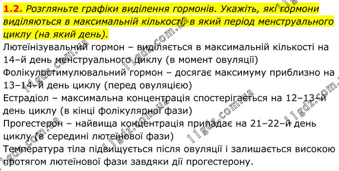 1.2. Розгляньте графіки виділення гормонів. Укажіть, які гормони виділяються в максимальній кількості, в який період менструального циклу (на який день). Лютеїнізувальний гормон – виділяється в максимальній кількості на 14–й день менструального циклу (в момент овуляції) Фолікулостимулювальний гормон – досягає максимуму приблизно на 13–14–й день циклу (перед овуляцією) Естрадіол – максимальна концентрація спостерігається на 12–13–й день циклу (в кінці фолікулярної фази) Прогестерон – найвища концентрація припадає на 21–22–й день циклу (в середині лютеїнової фази) Температура тіла підвищується після овуляції і залишається високою протягом лютеїнової фази завдяки дії прогестерону.