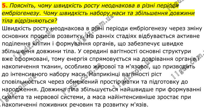 5. Поясніть, чому швидкість росту неоднакова в різні періоди ембріогенезу. Чому швидкість набору маси та збільшення довжини тіла відрізняються? Швидкість росту неоднакова в різні періоди ембріогенезу через зміну основних процесів розвитку. На ранніх стадіях відбувається активне поділення клітин і формування органів, що забезпечує швидке збільшення довжини тіла. У середині вагітності основні структури вже сформовані, тому енергія спрямовується на дозрівання органів і накопичення тканин, особливо жирової та м'язової, що призводить до інтенсивного набору маси. Наприкінці вагітності ріст сповільнюється через обмежений простір матки та підготовку до народження. Довжина тіла збільшується найшвидше при формуванні скелета та нервової системи, а маса найінтенсивніше зростає при накопиченні поживних речовин та розвитку м'язів.