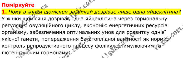Поміркуйте 1. Чому в жінки щомісяця зазвичай дозріває лише одна яйцеклітина? У жінки щомісяця дозріває одна яйцеклітина через гормональну регуляцію овуляційного циклу, економію енергетичних ресурсів організму, забезпечення оптимальних умов для розвитку однієї якісної гамети, попередження багатоплідної вагітності як норми, контроль репродуктивного процесу фолікулостимулюючим та лютеїнізуючим гормонами.