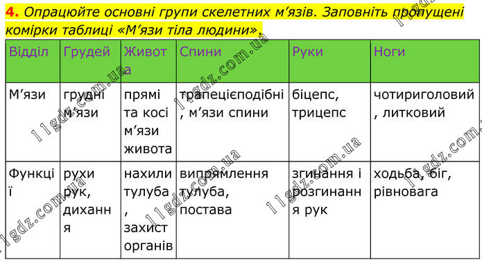 4. Опрацюйте основні групи скелетних м’язів. Заповніть пропущені комірки таблиці «М’язи тіла людини».