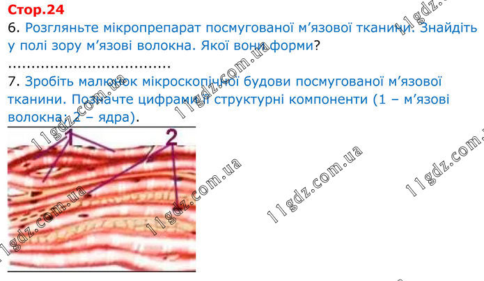 6. Розгляньте мікропрепарат посмугованої м’язової тканини. Знайдіть у полі зору м’язові волокна. Якої вони форми? Мають циліндричну форму. 7. Зробіть малюнок мікроскопічної будови посмугованої м’язової тканини. Позначте цифрами її структурні компоненти (1 – м’язові волокна; 2 – ядра).