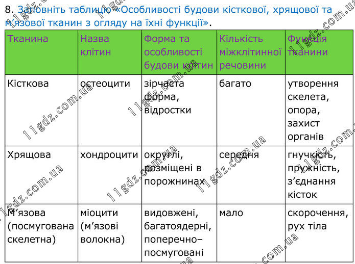 8. Заповніть таблицю «Особливості будови кісткової, хрящової та м’язової тканин з огляду на їхні функції».