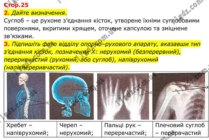 2. Дайте визначення. Суглоб – це рухоме з’єднання кісток, утворене їхніми суглобовими поверхнями, вкритими хрящем, оточене капсулою та зміцнене зв’язками. 3. Підпишіть фото відділу опорно–рухового апарату, вказавши тип з’єднання кісток, позначених X: нерухомий (безперервний), переривчастий (рухомий, або суглоб), напіврухомий (напівпереривчастий). Хребет – напіврухомий; Череп – нерухомий; Пальці рук – перервчастий; Плечовий суглоб – перервчастий.