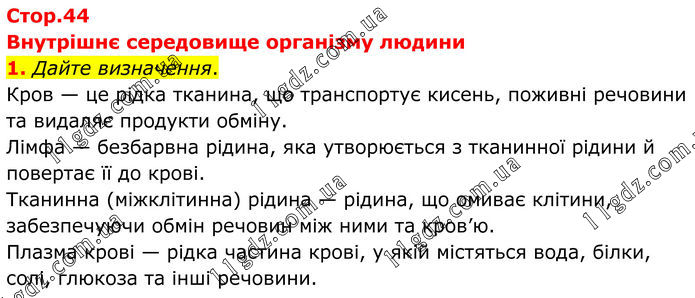 Внутрішнє середовище організму людини 1. Дайте визначення. Кров — це рідка тканина, що транспортує кисень, поживні речовини та видаляє продукти обміну. Лімфа — безбарвна рідина, яка утворюється з тканинної рідини й повертає її до крові. Тканинна (міжклітинна) рідина — рідина, що омиває клітини, забезпечуючи обмін речовин між ними та кров’ю. Плазма крові — рідка частина крові, у якій містяться вода, білки, солі, глюкоза та інші речовини.