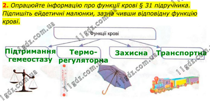 2. Опрацюйте інформацію про функції крові § 31 підручника. Підпишіть ейдетичні малюнки, зазначивши відповідну функцію крові.