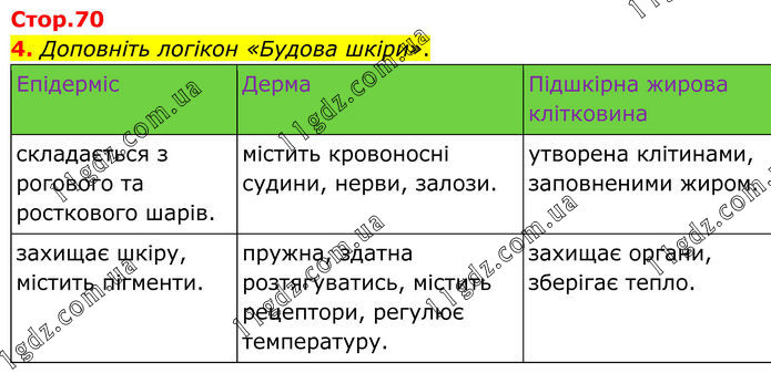 4. Доповніть логікон «Будова шкіри». Епідерміс Дерма Підшкірна жирова клітковина складається з рогового та росткового шарів. містить кровоносні судини, нерви, залози. утворена клітинами, заповненими жиром. захищає шкіру, містить пігменти. пружна, здатна розтягуватись, містить рецептори, регулює температуру. захищає органи, зберігає тепло.