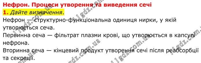 Нефрон. Процеси утворення та виведення сечі 1. Дайте визначення. Нефрон — структурно-функціональна одиниця нирки, у якій утворюється сеча. Первинна сеча — фільтрат плазми крові, що утворюється в капсулі нефрона. Вторинна сеча — кінцевий продукт утворення сечі після реабсорбції та секреції.