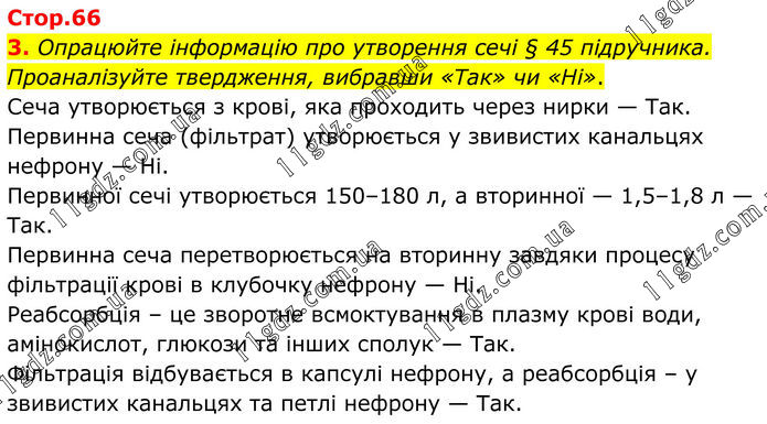 3. Опрацюйте інформацію про утворення сечі § 45 підручника. Проаналізуйте твердження, вибравши «Так» чи «Ні». Сеча утворюється з крові, яка проходить через нирки — Так. Первинна сеча (фільтрат) утворюється у звивистих канальцях нефрону — Ні. Первинної сечі утворюється 150–180 л, а вторинної — 1,5–1,8 л — Так. Первинна сеча перетворюється на вторинну завдяки процесу фільтрації крові в клубочку нефрону — Ні. Реабсорбція – це зворотне всмоктування в плазму крові води, амінокислот, глюкози та інших сполук — Так. Фільтрація відбувається в капсулі нефрону, а реабсорбція – у звивистих канальцях та петлі нефрону — Так.