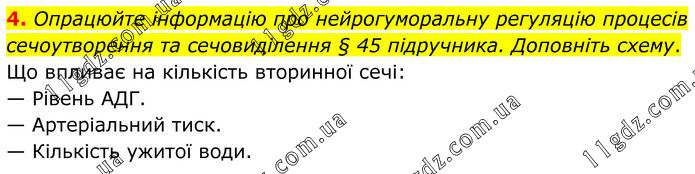 4. Опрацюйте інформацію про нейрогуморальну регуляцію процесів сечоутворення та сечовиділення § 45 підручника. Доповніть схему. Що впливає на кількість вторинної сечі: — Рівень АДГ. — Артеріальний тиск. — Кількість ужитої води.