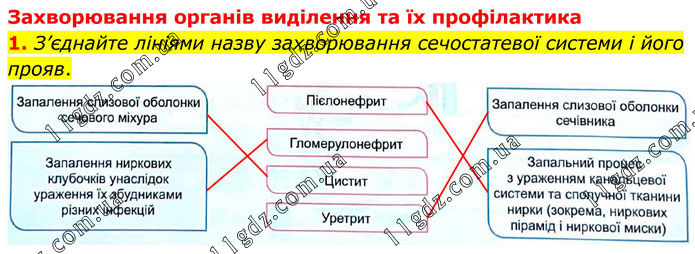 Захворювання органів виділення та їх профілактика 1. З’єднайте лініями назву захворювання сечостатевої системи і його прояв.