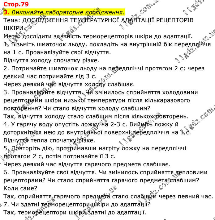 3. Виконайте лабораторне дослідження. Тема: ДОСЛІДЖЕННЯ ТЕМПЕРАТУРНОЇ АДАПТАЦІЇ РЕЦЕПТОРІВ ШКІРИ Мета: дослідити здатність терморецепторів шкіри до адаптації. 1. Візьміть шматочок льоду, покладіть на внутрішній бік передпліччя на 1 с. Проаналізуйте свої відчуття. Відчуття холоду спочатку різке. 2. Потримайте шматочок льоду на передпліччі протягом 2 с; через деякий час потримайте лід 3 с. Через деякий час відчуття холоду слабшає. 3. Проаналізуйте відчуття. Чи змінилось сприйняття холодовими рецепторами шкіри низької температури після кількаразового повторення? Чи стало відчуття холоду слабшим? Так, відчуття холоду стало слабшим після кількох повторень. 4. У гарячу воду опустіть ложку на 2-3 с. Вийміть ложку й доторкніться нею до внутрішньої поверхні передпліччя на 1 с. Відчуття тепла спочатку різке. 5. Повторіть дію, протримавши нагріту ложку на передпліччі протягом 2 с, потім потримайте її 3 с. Через деякий час відчуття гарячого предмета слабшає. 6. Проаналізуйте свої відчуття. Чи змінилось сприйняття тепловими рецепторами? Чи стало сприйняття гарячого предмета слабшим? Коли саме? Так, сприйняття гарячого предмета стало слабшим через певний час. 7. Чи здатні терморецептори шкіри до адаптації? Так, терморецептори шкіри здатні до адаптації.