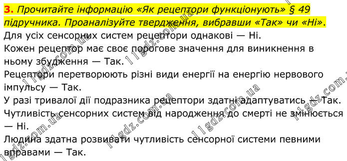3. Прочитайте інформацію «Як рецептори функціонують» § 49 підручника. Проаналізуйте твердження, вибравши «Так» чи «Ні». Для усіх сенсорних систем рецептори однакові — Ні. Кожен рецептор має своє порогове значення для виникнення в ньому збудження — Так. Рецептори перетворюють різні види енергії на енергію нервового імпульсу — Так. У разі тривалої дії подразника рецептори здатні адаптуватись — Так. Чутливість сенсорних систем від народження до смерті не змінюється — Ні. Людина здатна розвивати чутливість сенсорної системи певними вправами — Так.