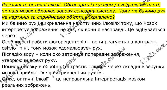Розгляньте оптичні ілюзії. Обговоріть із сусідом / сусідкою по парті, як наш мозок обманює зорову сенсорну систему. Чому ми бачимо рух на картинці та сприймаємо об’єкти викривлено? Ми бачимо рух і викривлення на оптичних ілюзіях тому, що мозок інтерпретує зображення не так, як вони є насправді. Це відбувається через: Особливості роботи фоторецепторів – вони реагують на контраст, світло і тіні, тому мозок «домальовує» рух. Післядію зору – коли око затримує попереднє зображення, утворюючи ефект руху. Помилки мозку в обробці контрастів і ліній – через складні візерунки мозок сприймає їх як викривлені чи рухомі. Отже, оптичні ілюзії — це неправильна інтерпретація мозком реальних зображень.