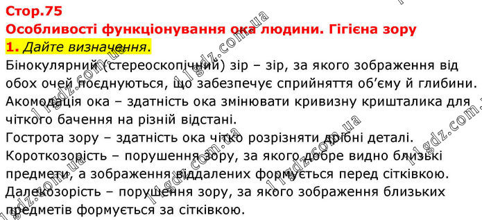 Особливості функціонування ока людини. Гігієна зору 1. Дайте визначення. Бінокулярний (стереоскопічний) зір – зір, за якого зображення від обох очей поєднуються, що забезпечує сприйняття об’єму й глибини. Акомодація ока – здатність ока змінювати кривизну кришталика для чіткого бачення на різній відстані. Гострота зору – здатність ока чітко розрізняти дрібні деталі. Короткозорість – порушення зору, за якого добре видно близькі предмети, а зображення віддалених формується перед сітківкою. Далекозорість – порушення зору, за якого зображення близьких предметів формується за сітківкою.
