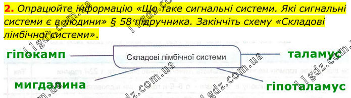 2. Опрацюйте інформацію «Що таке сигнальні системи. Які сигнальні системи є в людини» § 58 підручника. Закінчіть схему «Складові лімбічної системи».