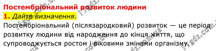 Постембріональний розвиток людини 1. Дайте визначення. Постембріональний (післязародковий) розвиток — це період розвитку людини від народження до кінця життя, що супроводжується ростом і віковими змінами організму.