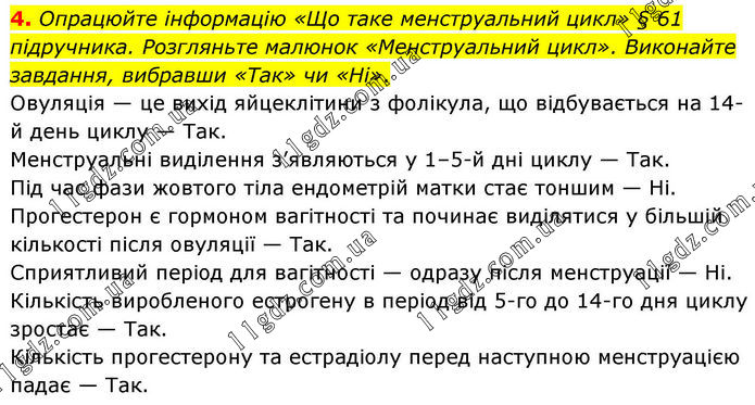 4. Опрацюйте інформацію «Що таке менструальний цикл» § 61 підручника. Розгляньте малюнок «Менструальний цикл». Виконайте завдання, вибравши «Так» чи «Ні». Овуляція — це вихід яйцеклітини з фолікула, що відбувається на 14-й день циклу — Так. Менструальні виділення з’являються у 1–5-й дні циклу — Так. Під час фази жовтого тіла ендометрій матки стає тоншим — Ні. Прогестерон є гормоном вагітності та починає виділятися у більшій кількості після овуляції — Так. Сприятливий період для вагітності — одразу після менструації — Ні. Кількість виробленого естрогену в період від 5-го до 14-го дня циклу зростає — Так. Кількість прогестерону та естрадіолу перед наступною менструацією падає — Так.