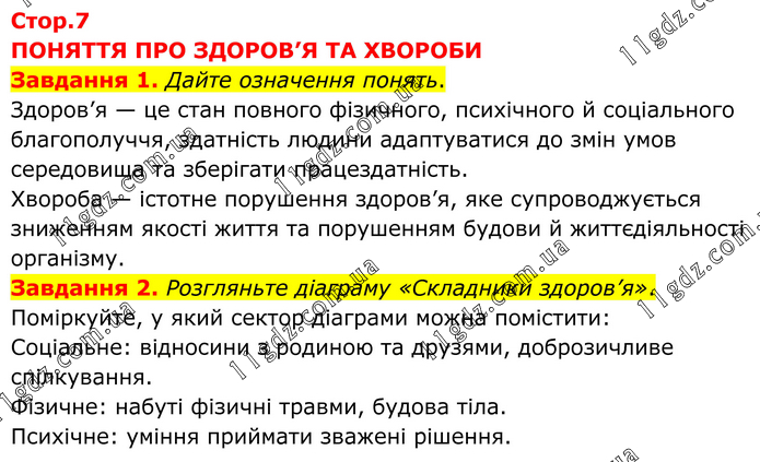 ПОНЯТТЯ ПРО ЗДОРОВ’Я TA ХВОРОБИ Завдання 1. Дайте означення понять. Здоров’я — це стан повного фізичного, психічного й соціального благополуччя, здатність людини адаптуватися до змін умов середовища та зберігати працездатність. Хвороба — істотне порушення здоров’я, яке супроводжується зниженням якості життя та порушенням будови й життєдіяльності організму. Завдання 2. Розгляньте діаграму «Складники здоров’я». Поміркуйте, у який сектор діаграми можна помістити: Соціальне: відносини з родиною та друзями, доброзичливе спілкування. Фізичне: набуті фізичні травми, будова тіла. Психічне: уміння приймати зважені рішення.