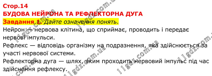 БУДОВА НЕЙРОНА TA РЕФЛЕКТОРНА ДУГА Завдання 1. Дайте означення понять. Нейрон — нервова клітина, що сприймає, проводить і передає нервові імпульси. Рефлекс — відповідь організму на подразнення, яка здійснюється за участі нервової системи. Рефлекторна дуга — шлях, яким проходить нервовий імпульс під час здійснення рефлексу.