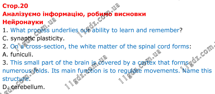 Аналізуємо інформацію, робимо висновки Нейронауки 1. What process underlies our ability to learn and remember? C. synaptic plasticity. 2. On a cross-section, the white matter of the spinal cord forms: A. funiculi. 3. This small part of the brain is covered by a cortex that forms numerous folds. Its main function is to regulate movements. Name this structure. D. cerebellum.