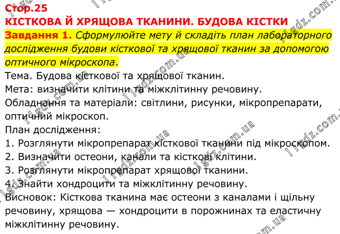 КІСТКОВА Й ХРЯЩОВА ТКАНИНИ. БУДОВА КІСТКИ Завдання 1. Сформулюйте мету й складіть план лабораторного дослідження будови кісткової та хрящової тканин за допомогою оптичного мікроскопа. Тема. Будова кісткової та хрящової тканин. Мета: визначити клітини та міжклітинну речовину. Обладнання та матеріали: світлини, рисунки, мікропрепарати, оптичний мікроскоп. План дослідження: 1. Розглянути мікропрепарат кісткової тканини під мікроскопом. 2. Визначити остеони, канали та кісткові клітини. 3. Розглянути мікропрепарат хрящової тканини. 4. Знайти хондроцити та міжклітинну речовину. Висновок: Кісткова тканина має остеони з каналами і щільну речовину, хрящова — хондроцити в порожнинах та еластичну міжклітинну речовину.