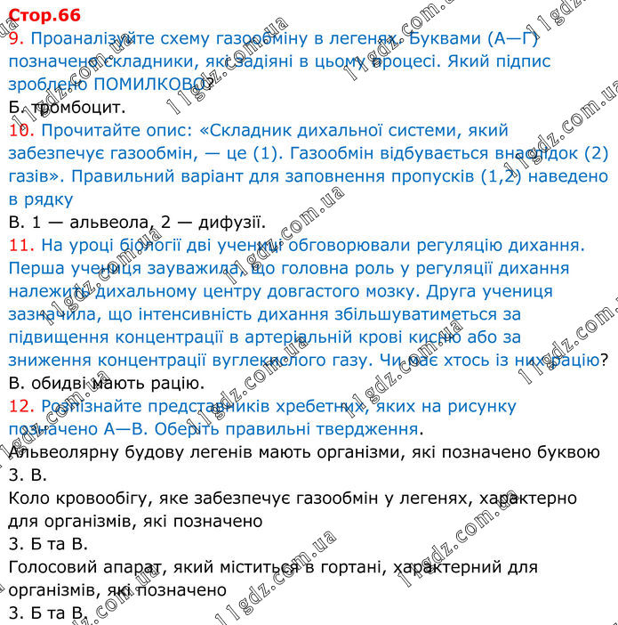 9. Проаналізуйте схему газообміну в легенях. Буквами (А—Г) позначено складники, які задіяні в цьому процесі. Який підпис зроблено ПОМИЛКОВО? Б. тромбоцит. 10. Прочитайте опис: «Складник дихальної системи, який забезпечує газообмін, — це (1). Газообмін відбувається внаслідок (2) газів». Правильний варіант для заповнення пропусків (1,2) наведено в рядку B. 1 — альвеола, 2 — дифузії. 11. На уроці біології дві учениці обговорювали регуляцію дихання. Перша учениця зауважила, що головна роль у регуляції дихання належить дихальному центру довгастого мозку. Друга учениця зазначила, що інтенсивність дихання збільшуватиметься за підвищення концентрації в артеріальній крові кисню або за зниження концентрації вуглекислого газу. Чи має хтось із них рацію? В. обидві мають рацію. 12. Розпізнайте представників хребетних, яких на рисунку позначено А—В. Оберіть правильні твердження. Альвеолярну будову легенів мають організми, які позначено буквою 3. В. Коло кровообігу, яке забезпечує газообмін у легенях, характерно для організмів, які позначено 3. Б та В. Голосовий апарат, який міститься в гортані, характерний для організмів, які позначено 3. Б та В.