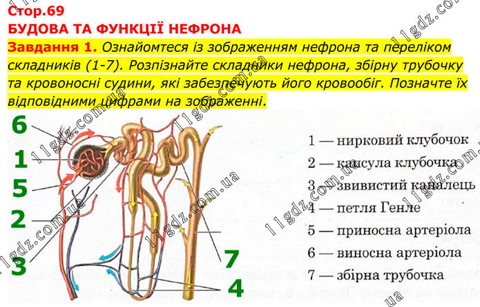 БУДОВА TA ФУНКЦІЇ НЕФРОНА Завдання 1. Ознайомтеся із зображенням нефрона та переліком складників (1-7). Розпізнайте складники нефрона, збірну трубочку та кровоносні судини, які забезпечують його кровообіг. Позначте їх відповідними цифрами на зображенні.