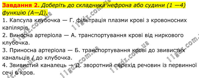 Завдання 2. Доберіть до складника нефрона або судини (1 —4) функцію (А—Д). 1. Капсула клубочка — Г. фільтрація плазми крові з кровоносних капілярів. 2. Виносна артеріола — А. транспортування крові від ниркового клубочка. 3. Приносна артеріола — Б. транспортування крові до звивистих канальців / до клубочка. 4. Звивистий каналець — Д. зворотний перехід речовин із первинної сечі в кров.