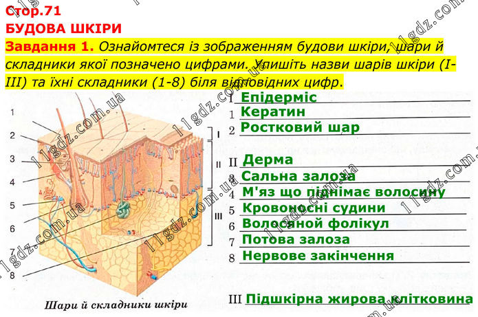БУДОВА ШКІРИ Завдання 1. Ознайомтеся із зображенням будови шкіри, шари й складники якої позначено цифрами. Упишіть назви шарів шкіри (I-III) та їхні складники (1-8) біля відповідних цифр.