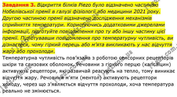 Завдання 3. Відкриття білків Piezo було відзначено частиною Нобелівської премії в галузі фізіології або медицини 2021 року. Другою частиною премії відзначено дослідження механізмів сприйняття температури. Користуючись додатковими джерелами інформації, підготуйте повідомлення про ту або іншу частину цієї премії. Підготувавши повідомлення про температурну чутливість, ви дізнаєтеся, чому гіркий перець або м’ята викликають у нас відчуття жару або прохолоди. Температурна чутливість пов’язана з роботою сенсорних рецепторів шкіри та слизових оболонок. Речовини з гіркого перцю (капсаїцин) активують рецептори, які зазвичай реагують на тепло, тому виникає відчуття жару. Речовини м’яти (ментол) активують рецептори холоду, через що з’являється відчуття прохолоди, хоча температура реально не змінюється.