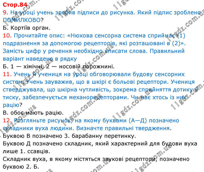 9. На уроці учень зробив підписи до рисунка. Який підпис зроблено ПОМИЛКОВО? Б. Кортіїв орган. 10. Прочитайте опис: «Нюхова сенсорна система сприймає (1) подразнення за допомогою рецепторів, які розташовані в (2)». Замість цифр у речення необхідно вписати слова. Правильний варіант наведено в рядку Б. 1 — хімічні, 2 — носовій порожнині. 11. Учень й учениця на уроці обговорювали будову сенсорних систем. Учень зауважив, що в шкірі є больові рецептори. Учениця стверджувала, що шкірна чутливість, зокрема сприйняття дотику й тиску, забезпечується механорецепторами. Чи має хтось із них рацію? В. обоє мають рацію. 12. Розгляньте рисунок, на якому буквами (А—Д) позначено складники вуха людини. Визначте правильні твердження. Буквою В позначено 3. барабанну перетинку. Буквою Д позначено складник, який характерний для будови вуха лише 1. ссавців. Складник вуха, в якому містяться звукові рецептори, позначено буквою 2. Б.